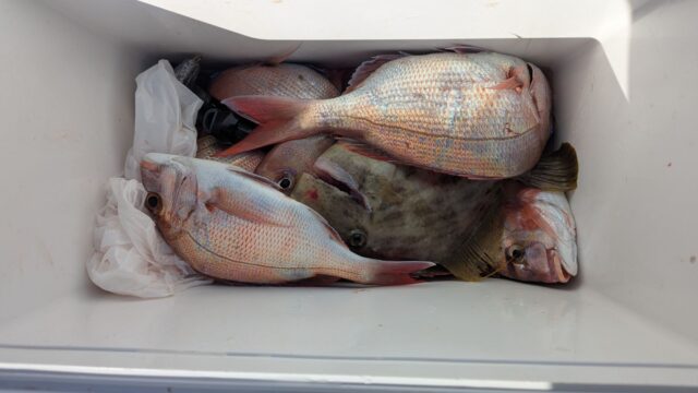 次第に慣れて、餌をバリバリ取られながらも手のひらサイズ〜40センチ弱の真鯛をポツリポツリと釣っていました。